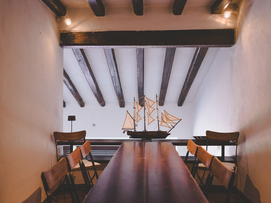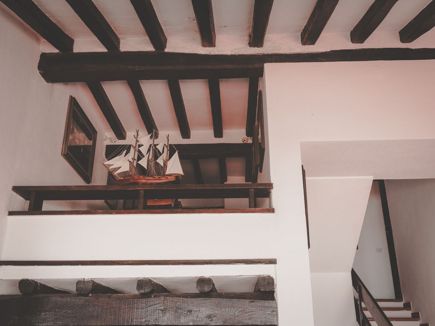 In designing the interior layout, we prioritized a continuous flow with varying heights and nested rooms, preserving the playful essence of the building’s architecture. Our goal was to enhance the house's structural elements by exposing the wooden beams and contrasting them against a neutral color palette on the walls and furniture. The classic lines of the interior furnishings and the indirect lighting scheme create a cohesive design thread throughout the home.